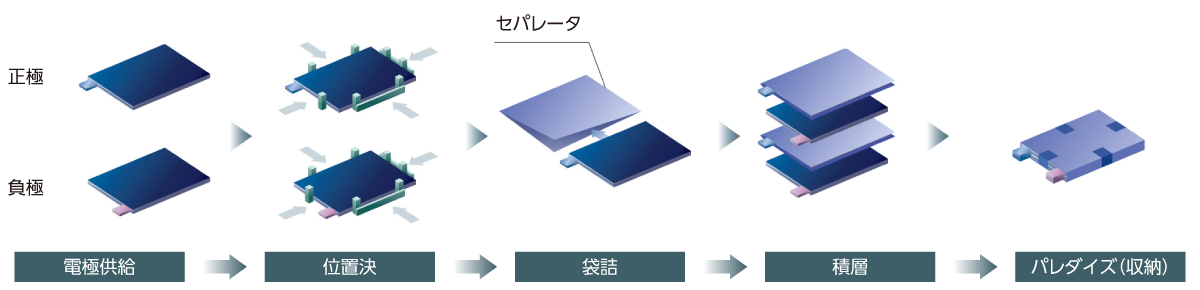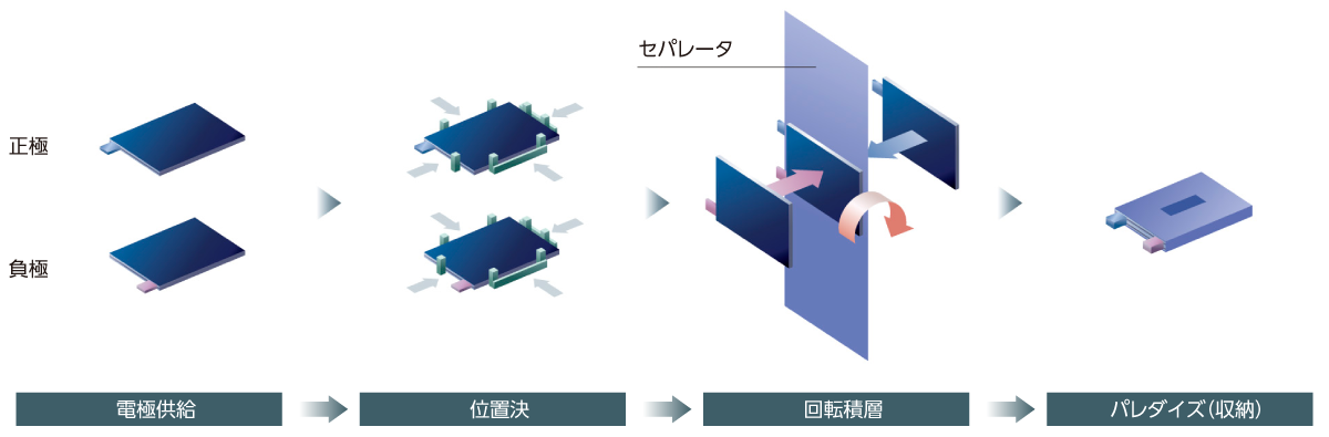 - 各種電池に適した各種積層方式に対応(葛折、回転、袋詰、枚葉)